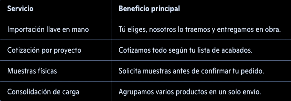Importa directamente tus acabados con respaldo y asesoría experta. Desde pisos, griferías y sanitarios hasta puertas y cocinas, te guiamos paso a paso para que tu constructora acceda a productos de mejor calidad, a menor costo, y con total trazabilidad desde China, Vietnam y USA.